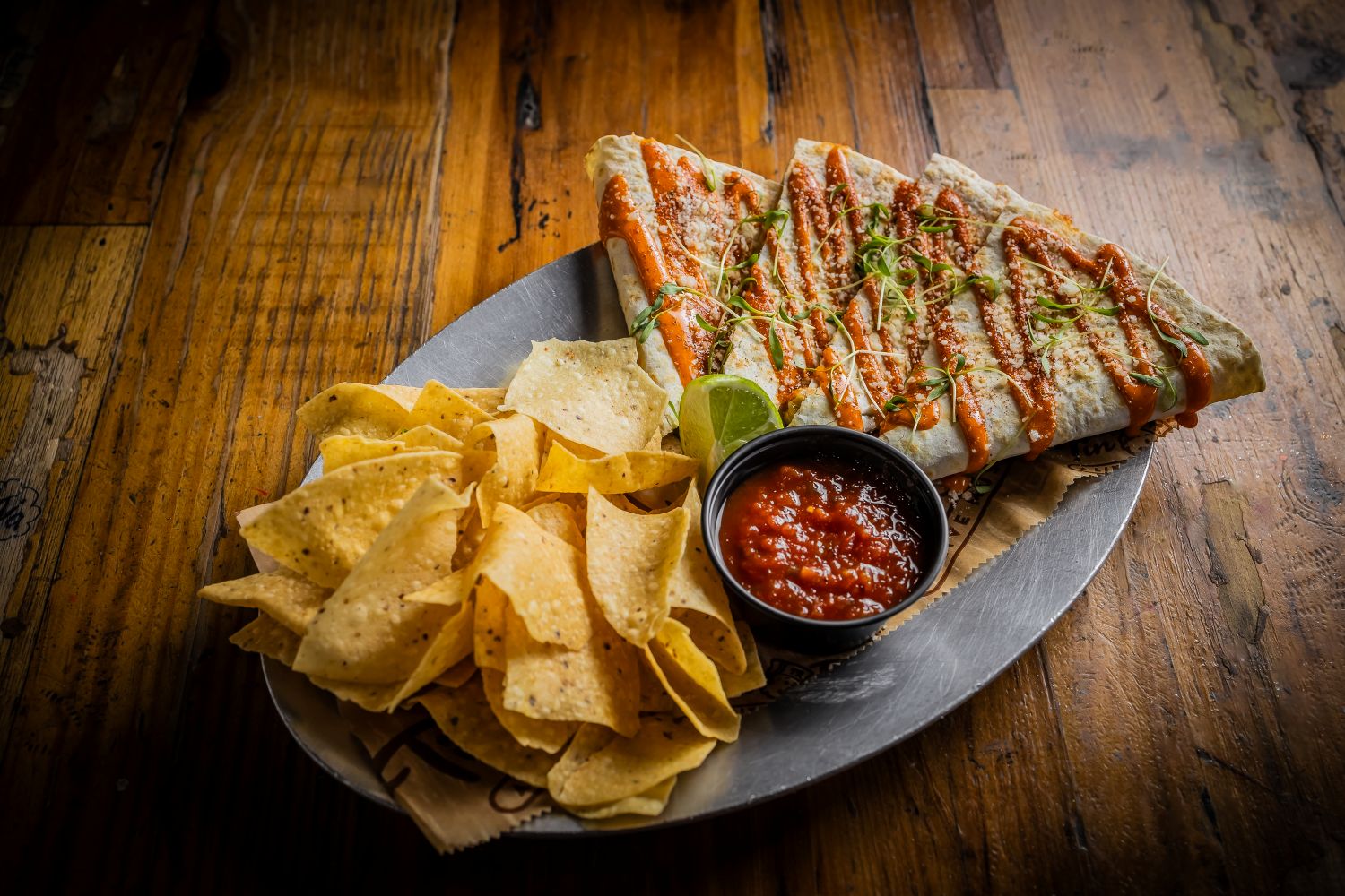 Street Corn Quesadilla – jack cheese, charred corn, cotija, spicy mayo, rib rub, cilantro, lime with an option to add chicken
